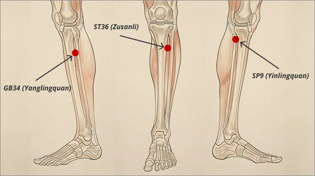 stymulacja punktów akupresurowych ST36, SP9 i GB34